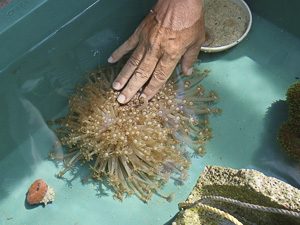 また、山城先生からクサビライシのお食事シーンを見せていただきました。シラスをクサビライシの上に乗せると、触手で運んで行って最後は中央の口に吸い込まれていきました。思っていたより早めのスピードでした。動きがなくて、一見、石のように見える生物も、他の生物と同様に摂餌をして、しっかりと生きていることを感じることができました。